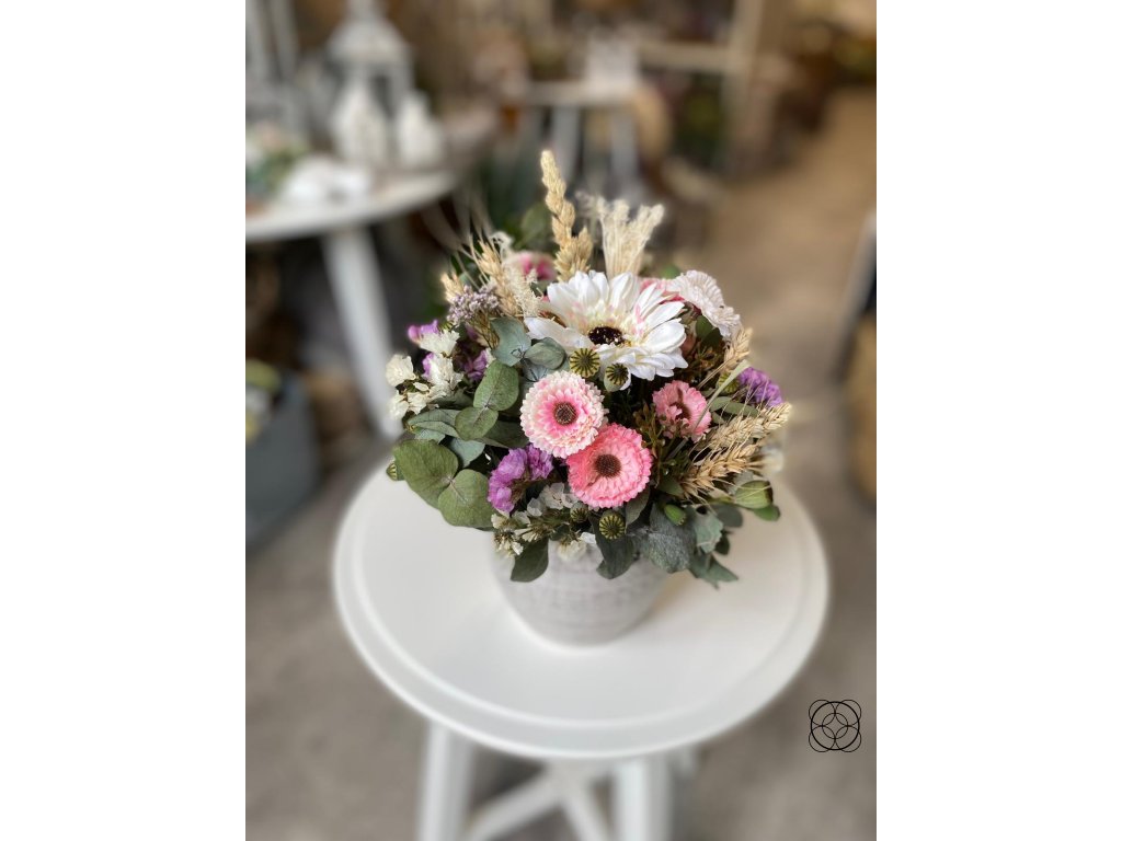 Aranžmá je zdobeno ze sušených komponentů obilí, makovice, traviny, statice, eukalyptusu a umělých květů sedmikrásky, gerbery.