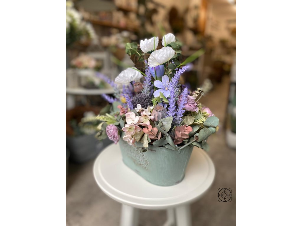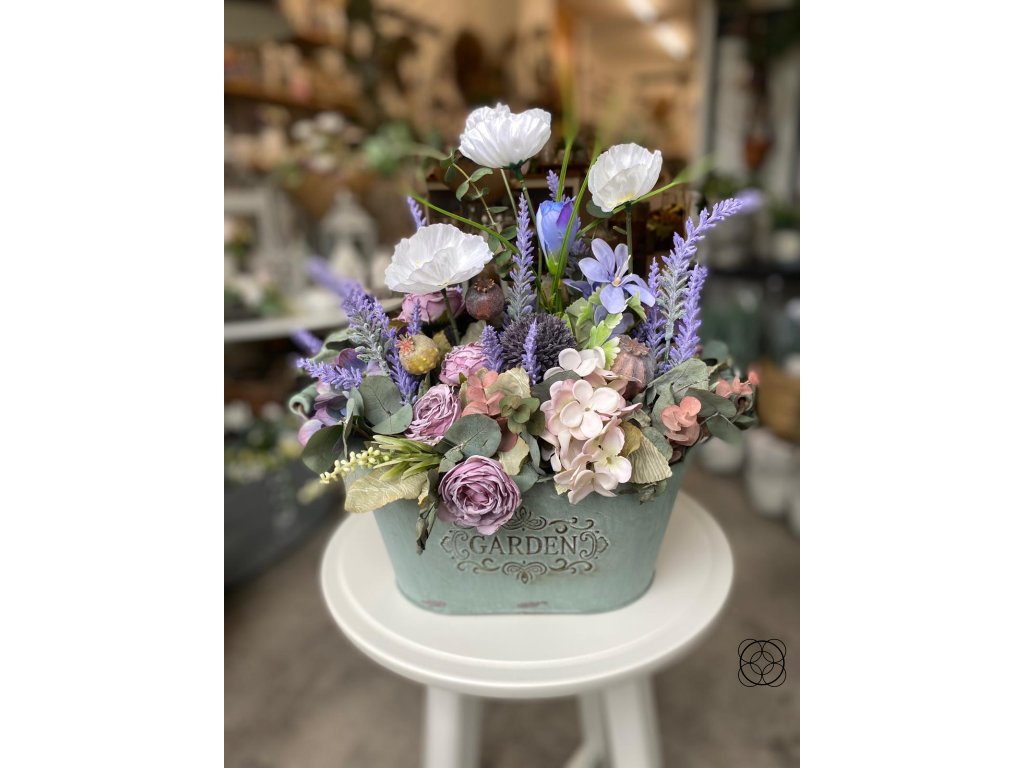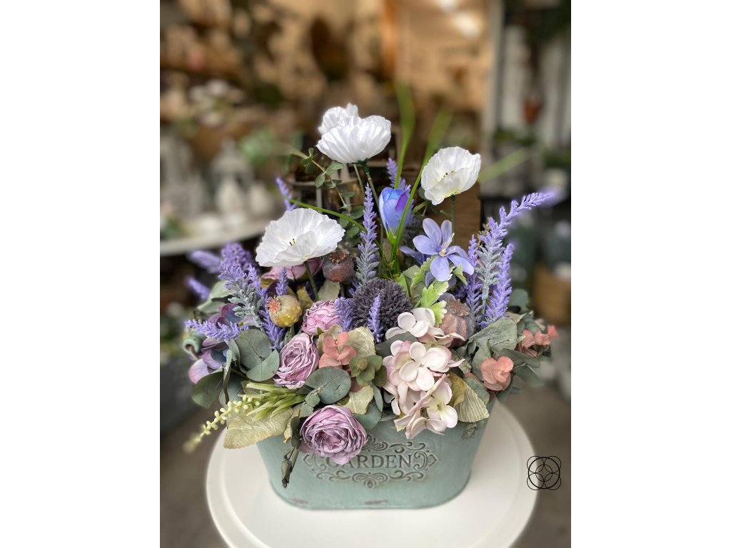 Aranžmá je zdobeno z umělých květů hortenzie, růží, levandule, bílého máku a makovice. Pro přirozený vzhled je aranžmá doplněno o přírodní eukalyptus.