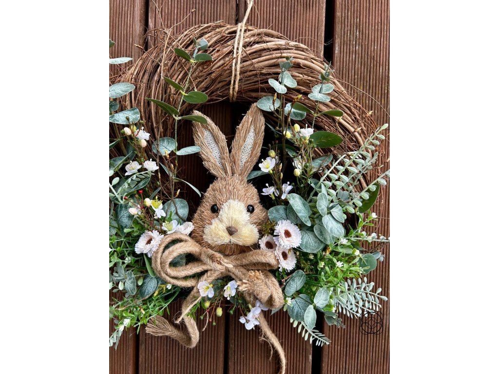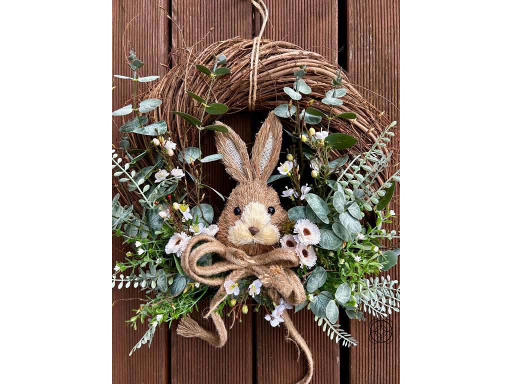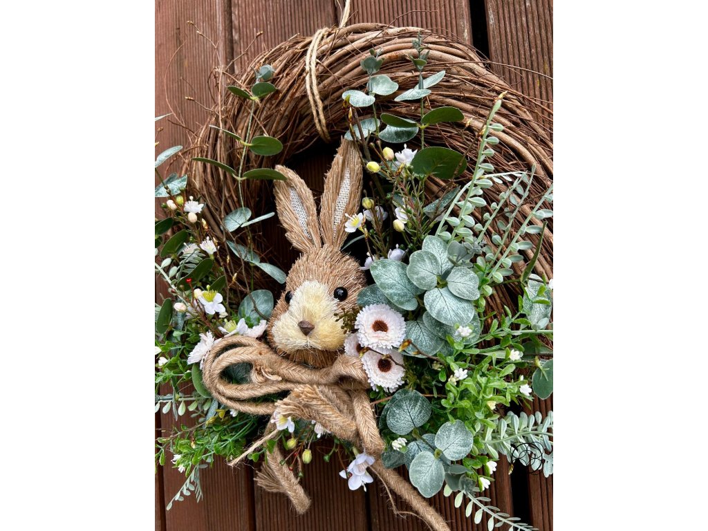Dominantou je dekorativní zajíček a výrazná jutová mašle, která krásně podtrhuje přírodní styl celé dekorace. Díky použití kvalitních trvanlivých materiálů vám bude věnec dělat radost po celé jarní a velikonoční období.