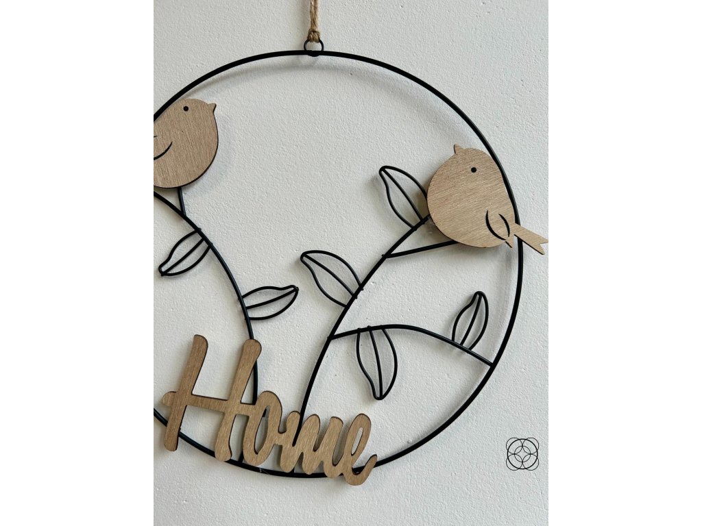 Závěsná dekorace ve tvaru kruhu s motivem ptáčků na větvičkách kombinuje kov a dřevo čímž vytváří útulný a stylový doplněk pro Váš domov. Tento dekorativní prvek přináší do prostoru příjemný oživení a zároveň vítá každého svým milým provedením.