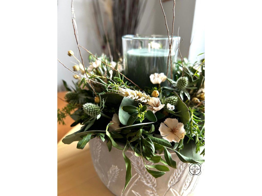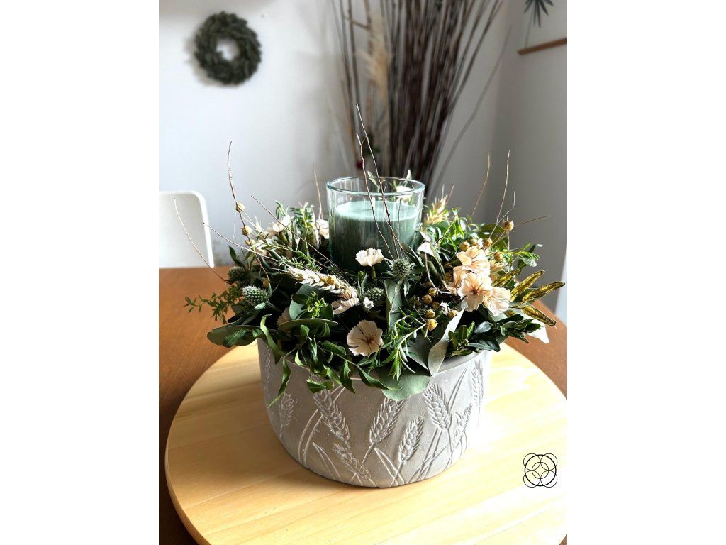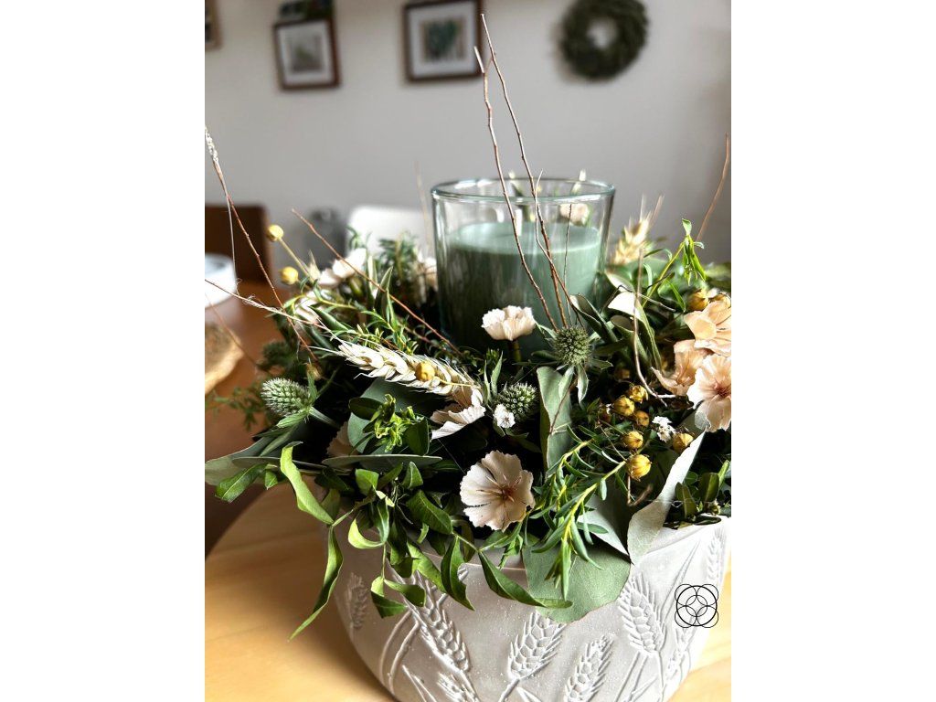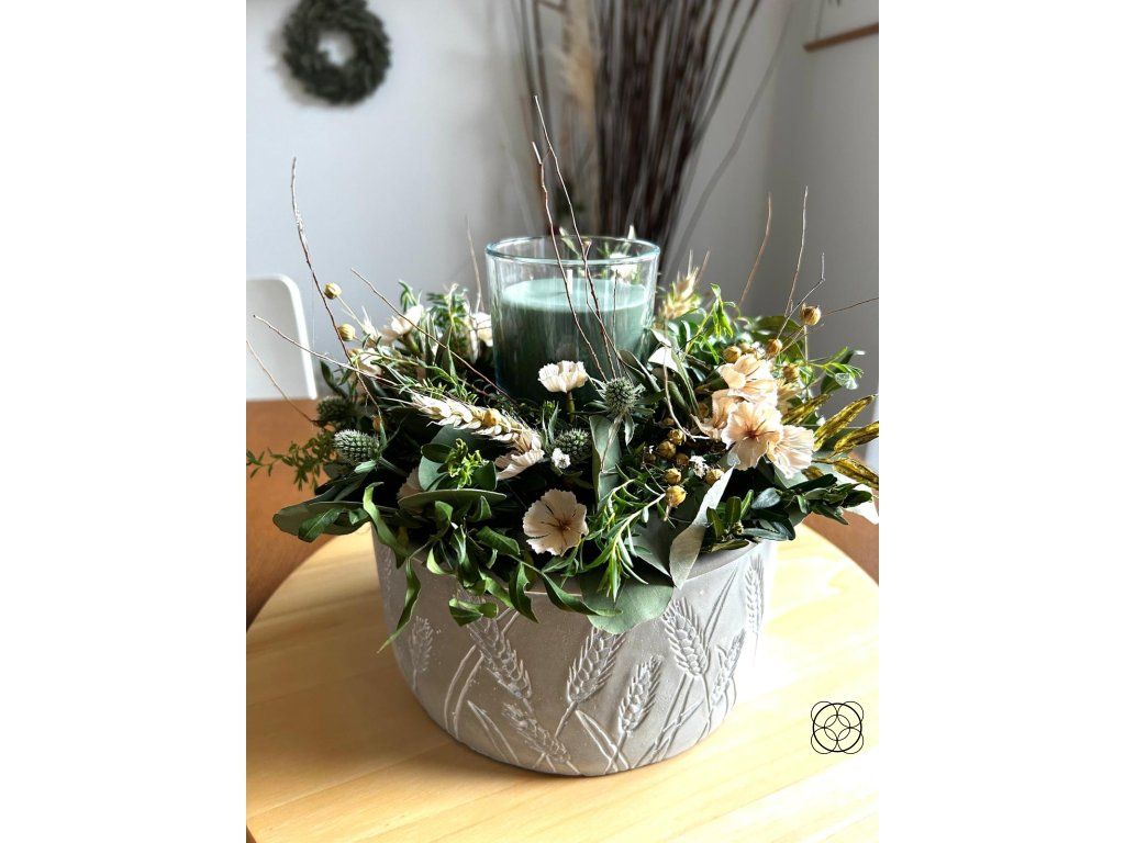 Elegantní svícen v přírodním stylu, který vnese do vašeho interiéru klid, harmonii a jemnou krásu přírody. Aranžmá je tvořeno z kvalitních přírodních materiálů, doplněných o pečlivě vybrané trvanlivé prvky v zemitých a zelených tónech.