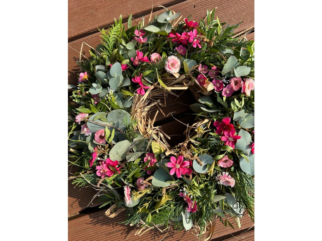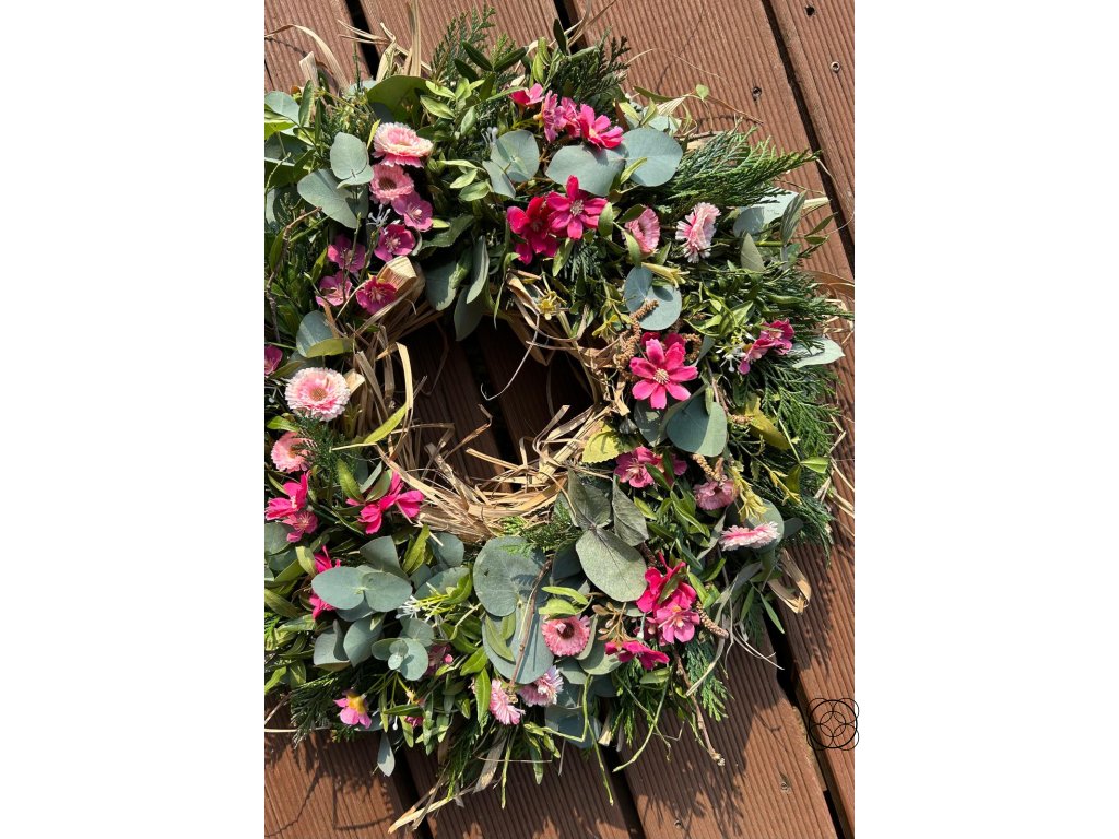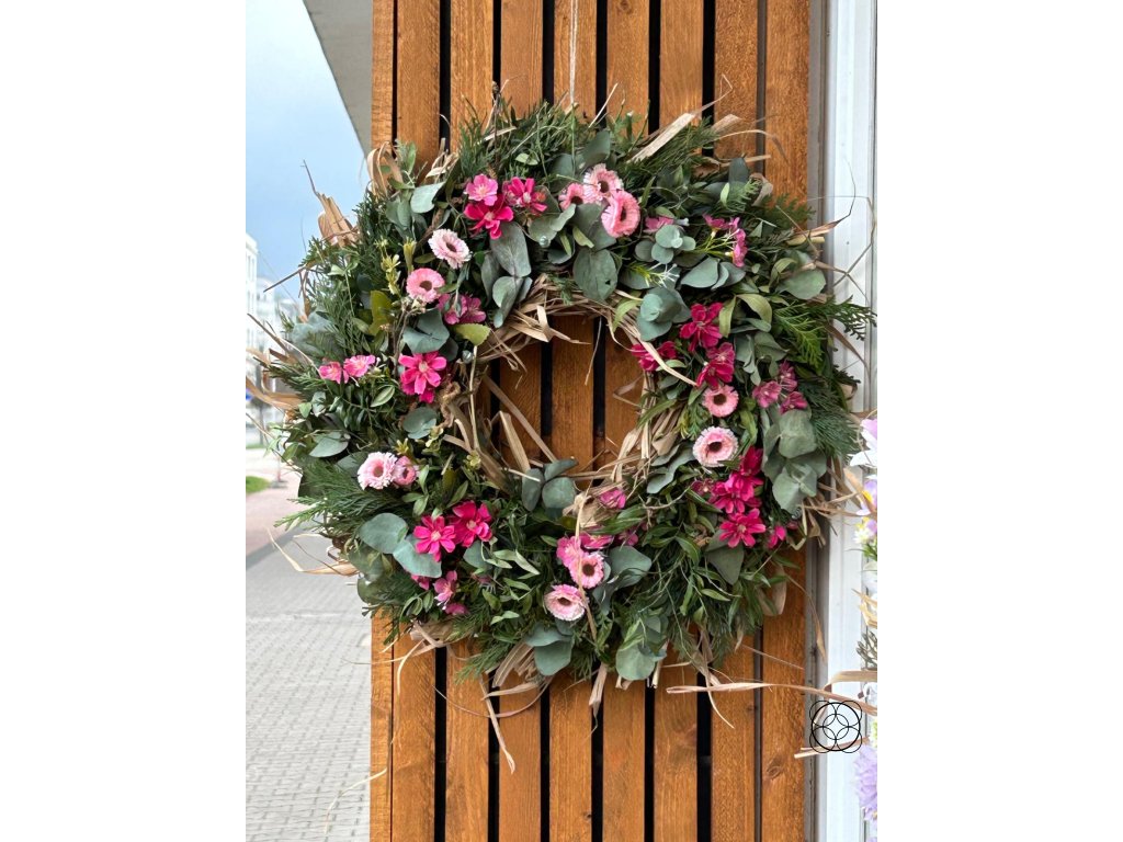 Tento elegantní ručně vázaný věnec je vyroben z přírodních větviček zeleně a vybraných sušených travin, doplněný o stálé umělé květy v jemných odstínech růžové a fuchsiové. Díky kombinaci přírodních materiálů a kvalitních umělých květů si zachovává svěží vzhled po dlouhou dobu. Skvěle se hodí jako dekorace na dveře, stěnu nebo jako výrazný prvek interiéru po celý rok.