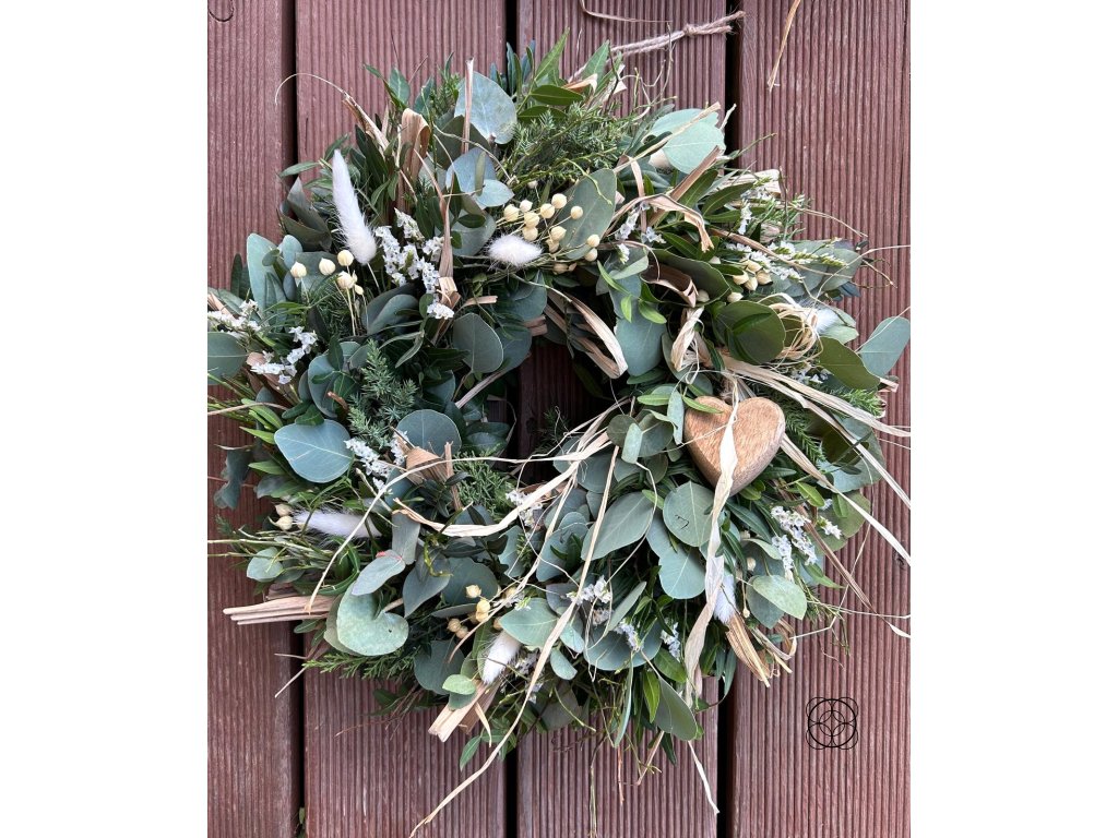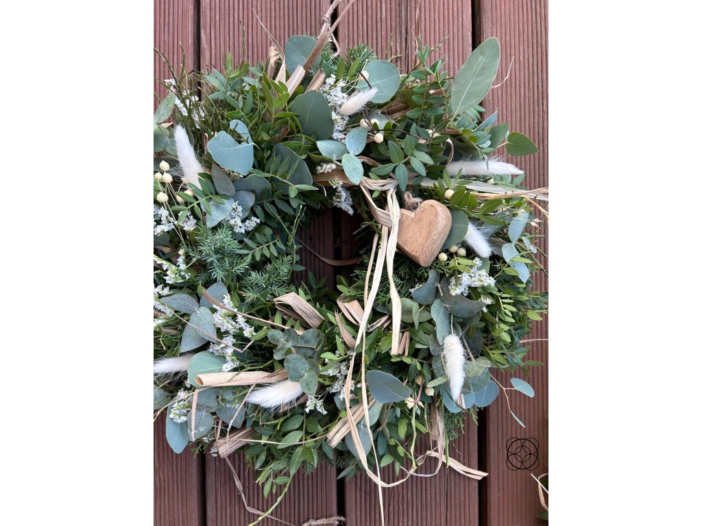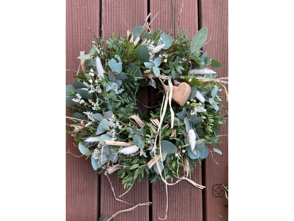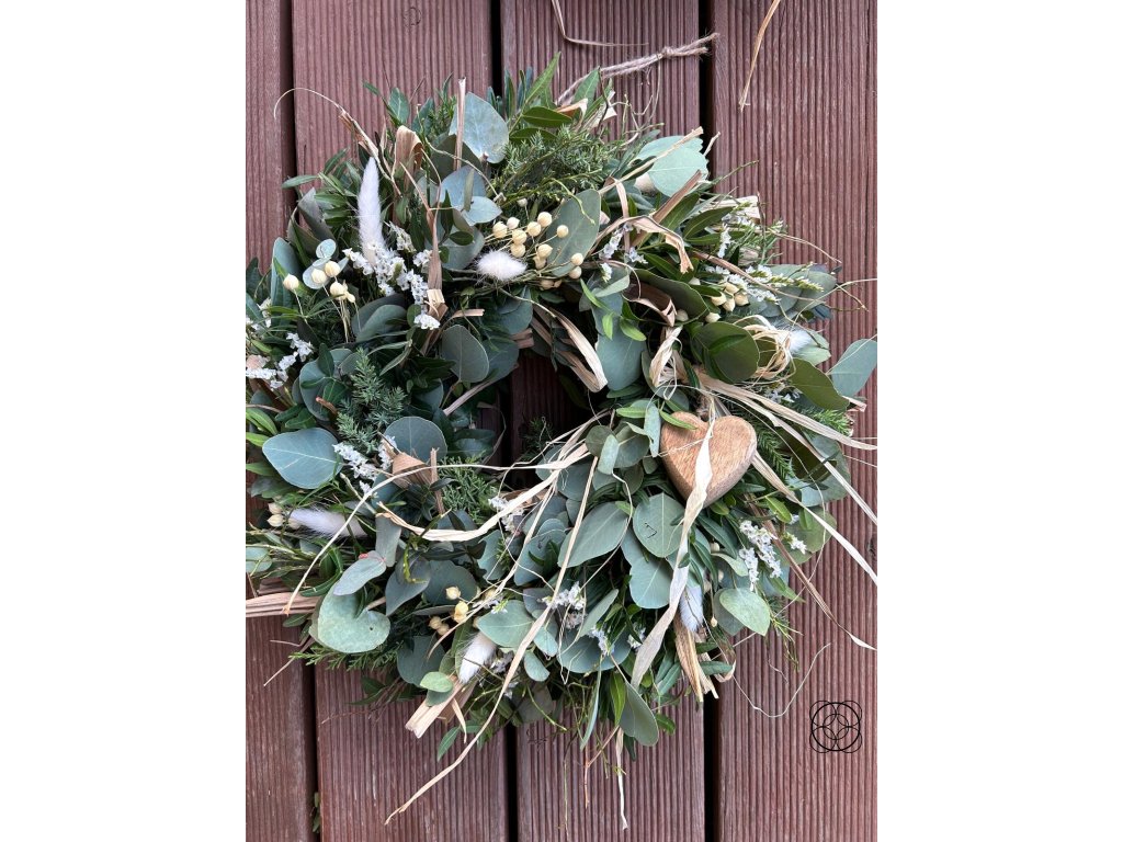 Přírodní zelený věnec se srdcem - pistácie a eukalyptus.