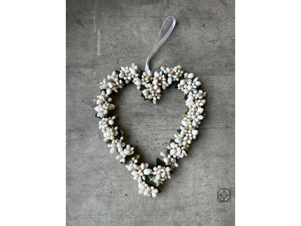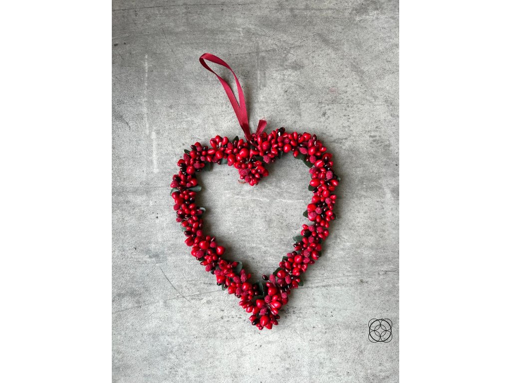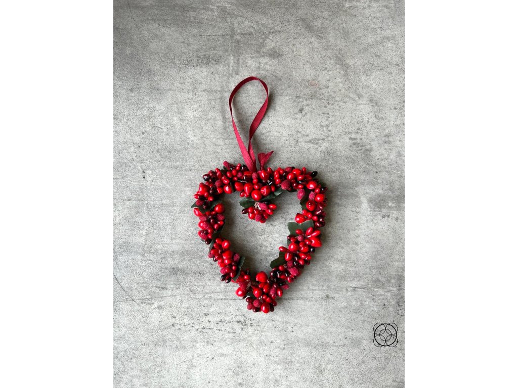 Dekorace je ozdobena pečlivě aranžovanými umělými bobulemi, které vytvářejí dokonale tvarované srdíčko. Díky poutku je ideální pro zavěšení na dveře, okno nebo stěnu kde bude nepřehlédnutelným dekoračním prvkem.
