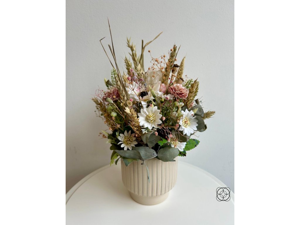 Použitý materiál: umělé květy mini růží, karafiátů, gerber, kopretinek, přírodní obilý, eukalyptus, makovičky, nevěstin závoj, vše stálé, neopadavé