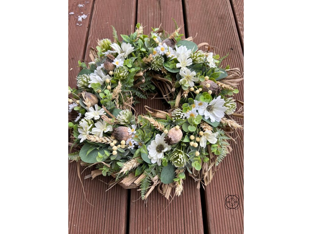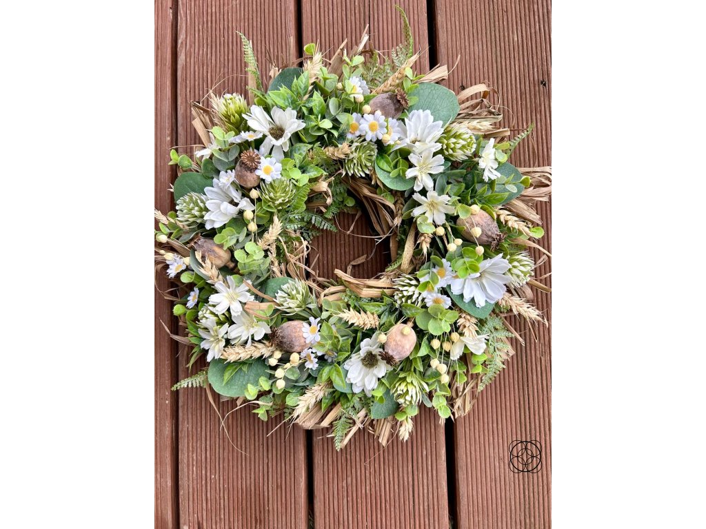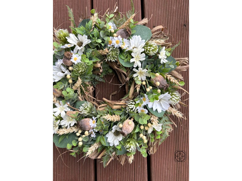 Použitý materiál: kvalitní umělé květy sedmikrásky, kopretiny, eukalyptus, bodláčí, buxus - vše stálé a trvalé. Věnec je doplněn přírodním lnem, slámou a obilím.