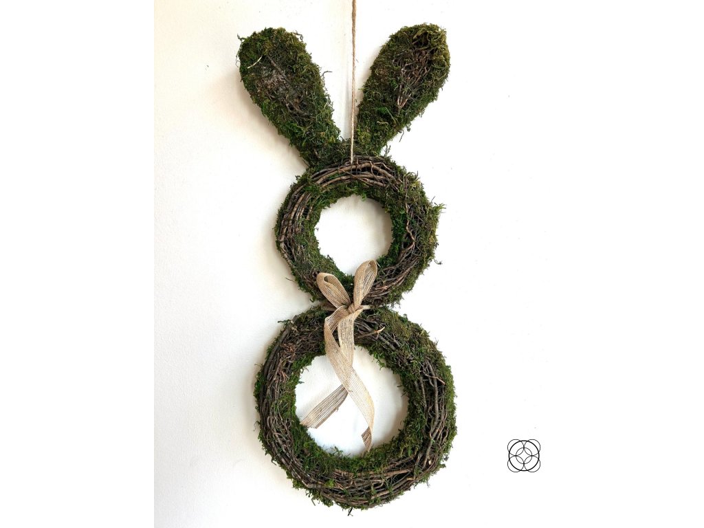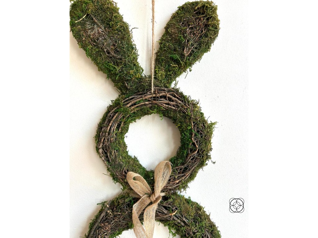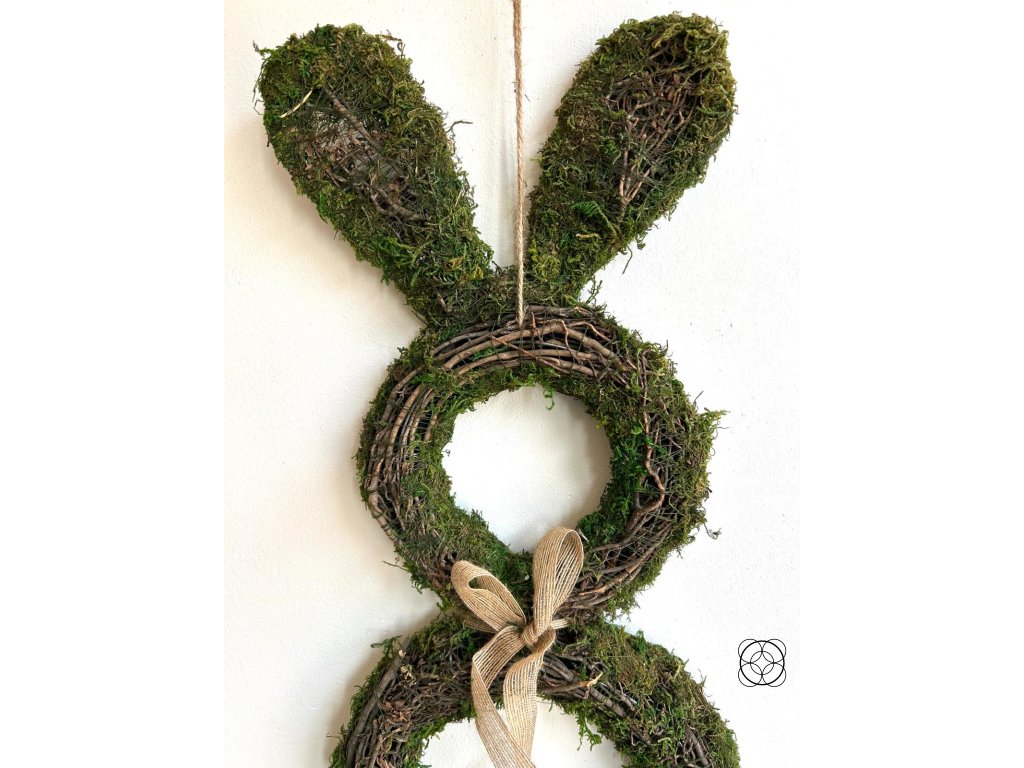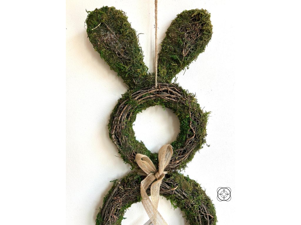 Přivítejte jako stylově s tímto přírodním velikonočním věncem! Tento originální věnec ve tvaru zajíčka je vyroben z proutí a pokrytý mechem, což mu dodává rustikální a přírodní vzhled. Doplněn jemnou jutovou mašlí. Skvěle se hodí na dveře, stěnu nebo jako velikonoční dekorace do interiéru. Věnec je ručně vyroben z přírodních materiálů.