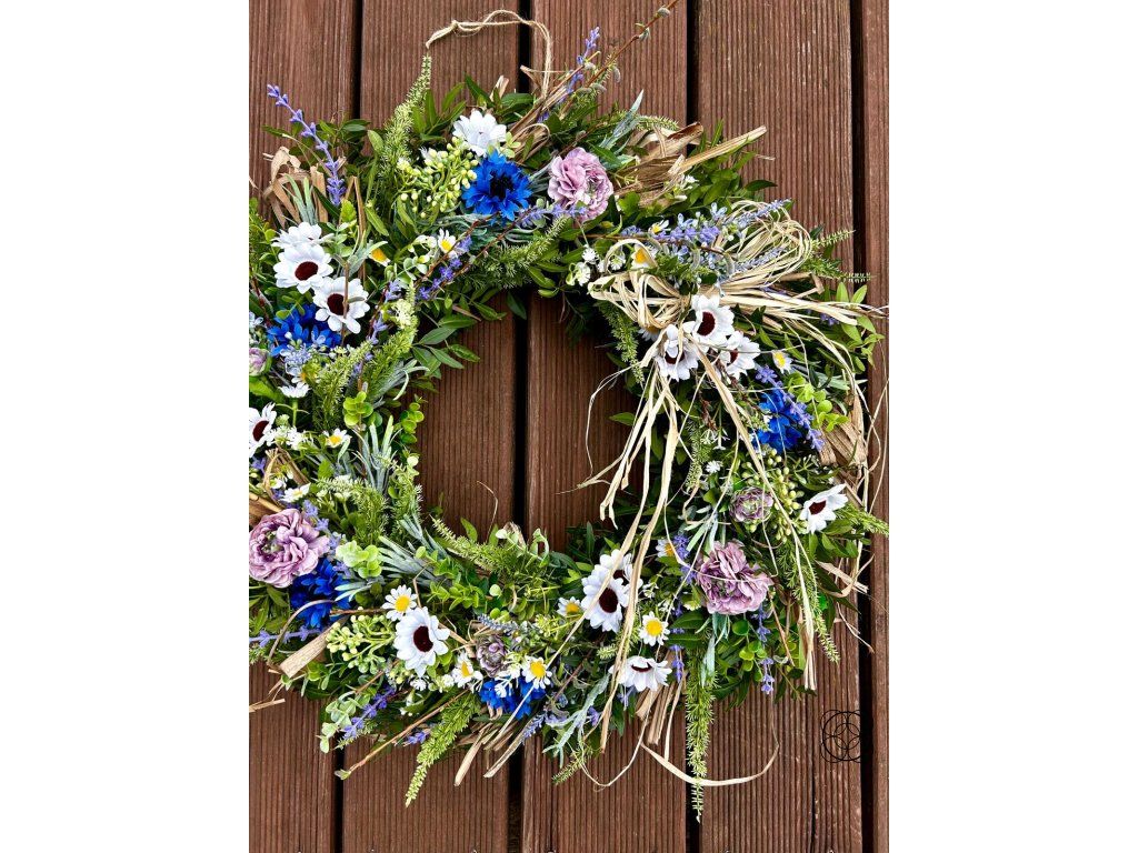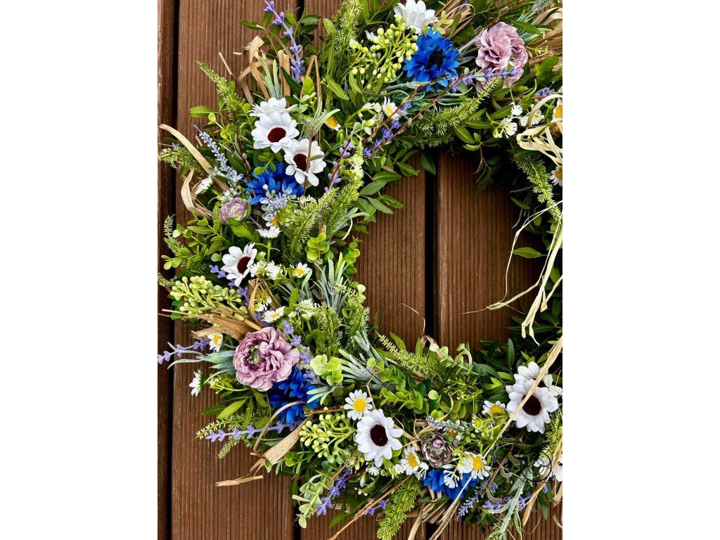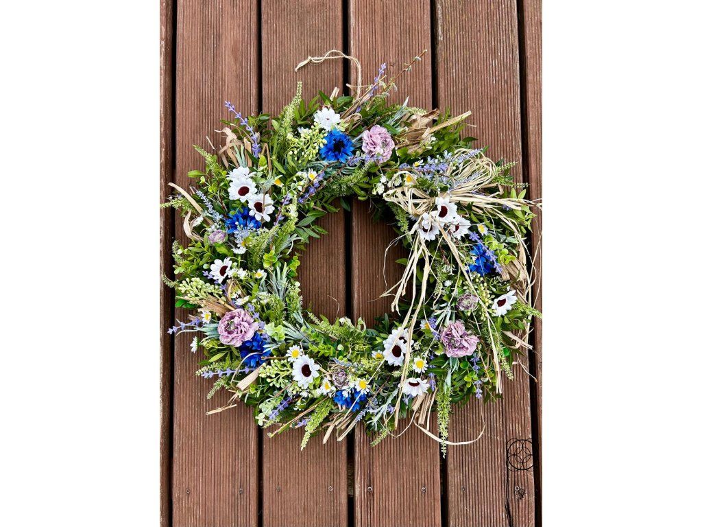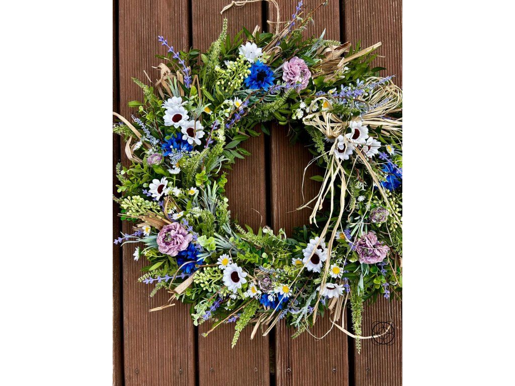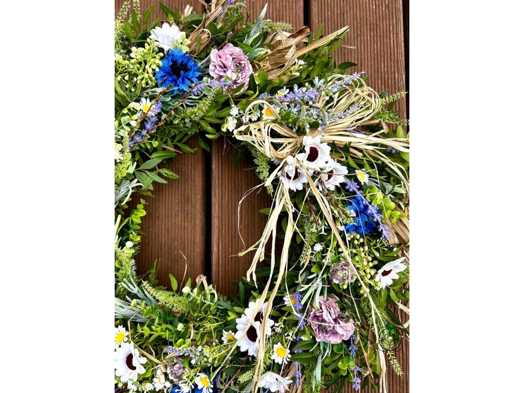 Tento bohatě zdobený věnec je harmonickou kombinací přírodních a kvalitních umělých materiálů, díky čemuž si zachovává svůj krásný vzhled po dlouhou dobu. Jemné květy, luční detaily a přírodní prvky vytvářejí svěží a přirozený dojem, který rozzáří každý vstupní prostor, dveře i interiér.